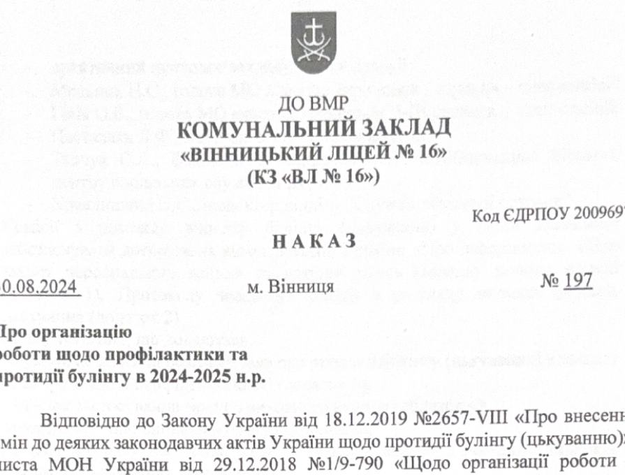 Про організацію роботи щодо запобігання та протидії булінгу на 2024-2025 н.р.