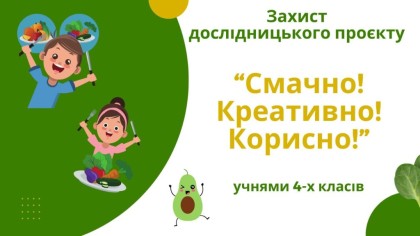 Місяць пошуку, творчості, дослідження, роботи над проєктом «Смачно! Креативно! Корисно!». Спочатку кожен клас досліджував власну тему: 4-А – «Шкода газованої води. Міф або реальність», учні 4-Б класу з’ясовували «Чи всі йогурти корисні?», дослідники 4-В класу зацікавились історією жувальної гумки, ліцеїсти 4-Г класу визначались щодо користі «швидкої» їжі «Фаст-фуд – їжа майбутнього або ризик для здоров’я», а науковці-практики 4-Д класу сперечались на тему «Чіпси – ласощі або отрута».